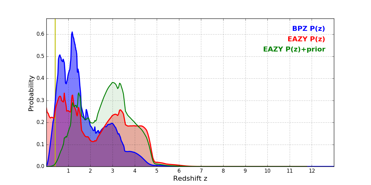 In P(z) plots: Yellow lines mark the cluster redshift z = 0.397,