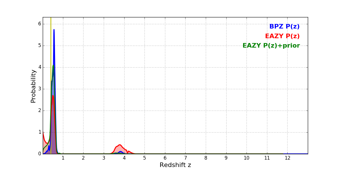 In P(z) plots: Yellow lines mark the cluster redshift z = 0.397,