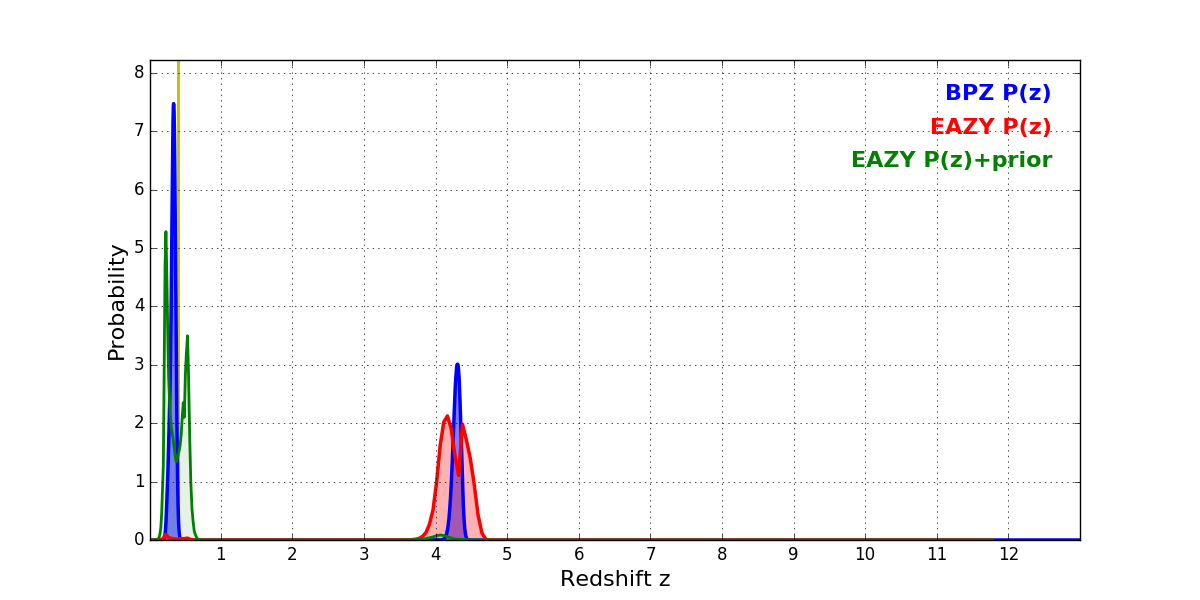 In P(z) plots: Yellow lines mark the cluster redshift z = 0.397,