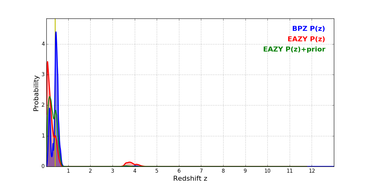 In P(z) plots: Yellow lines mark the cluster redshift z = 0.397,