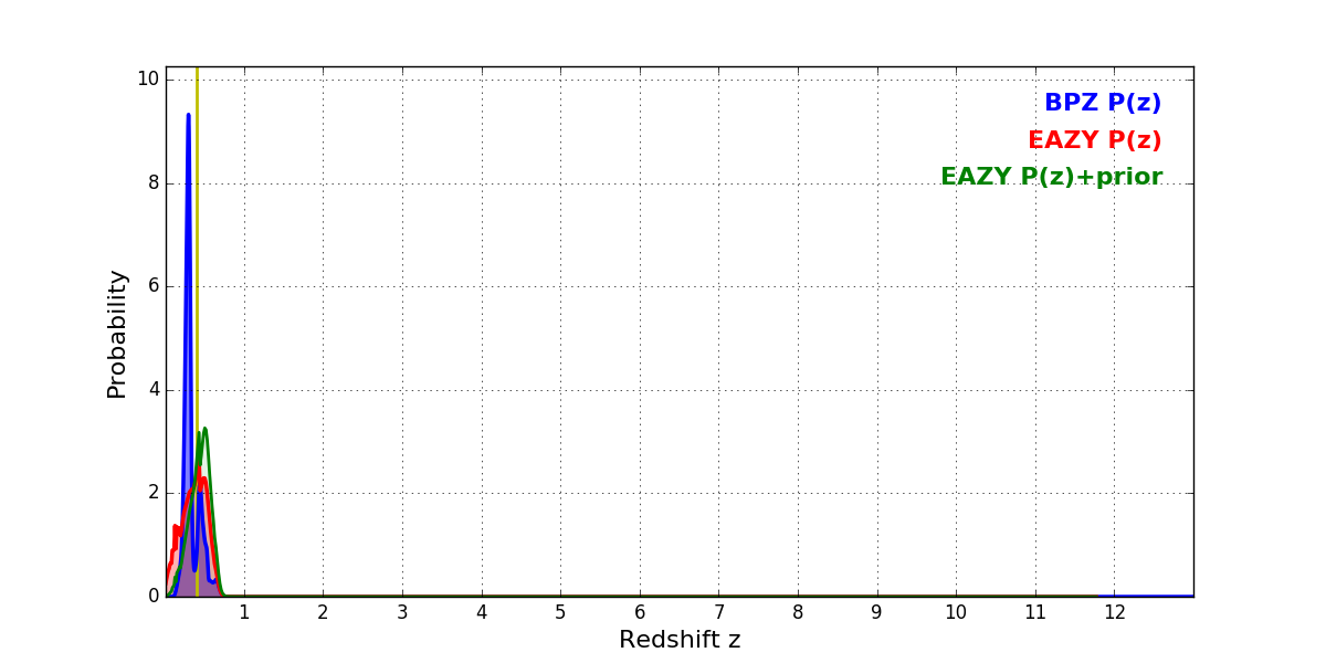 In P(z) plots: Yellow lines mark the cluster redshift z = 0.397,