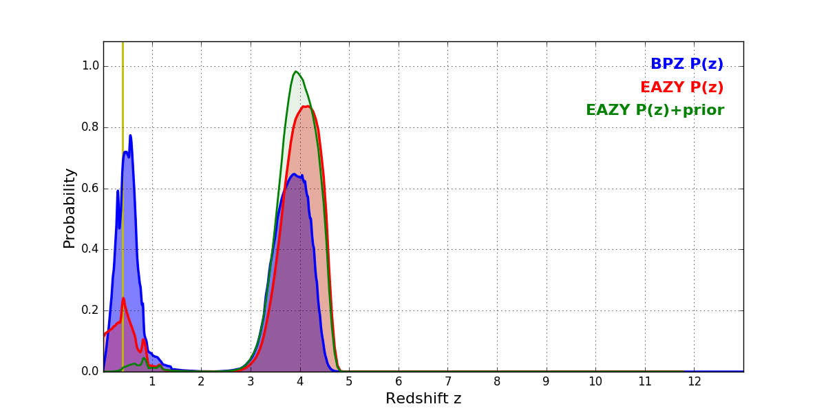 In P(z) plots: Yellow lines mark the cluster redshift z = 0.397,
