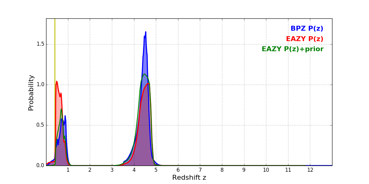 In P(z) plots: Yellow lines mark the cluster redshift z = 0.397,