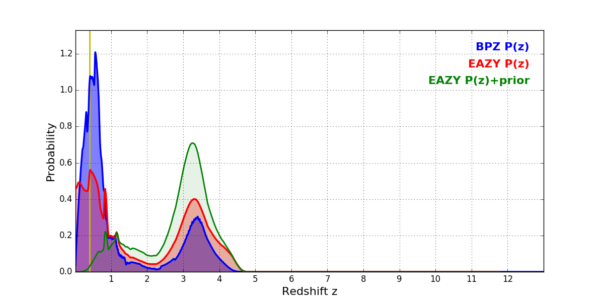 In P(z) plots: Yellow lines mark the cluster redshift z = 0.397,