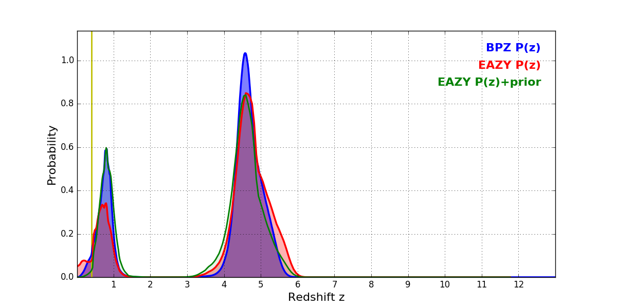 In P(z) plots: Yellow lines mark the cluster redshift z = 0.397,