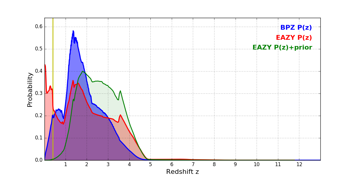 In P(z) plots: Yellow lines mark the cluster redshift z = 0.397,