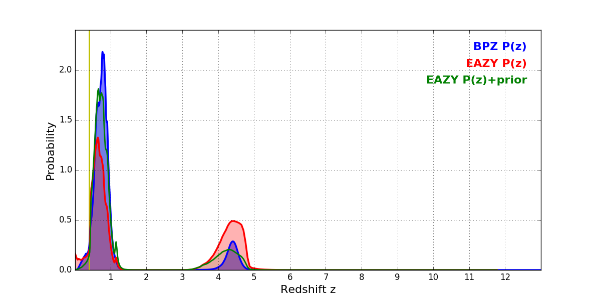 In P(z) plots: Yellow lines mark the cluster redshift z = 0.397,