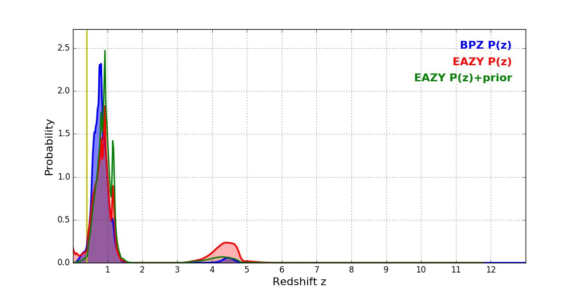 In P(z) plots: Yellow lines mark the cluster redshift z = 0.397,