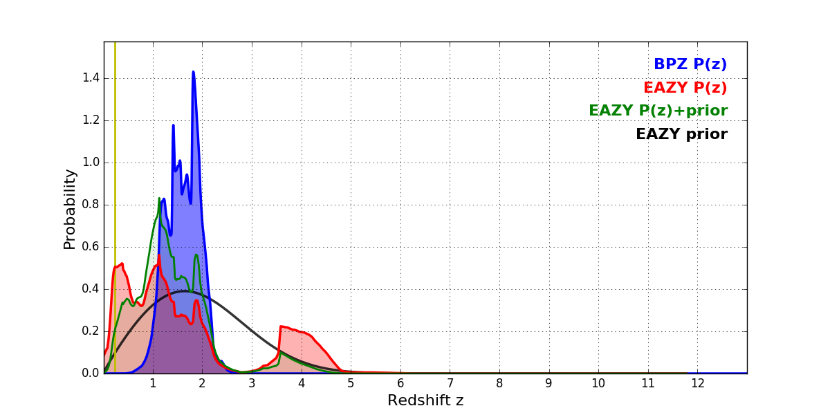 In P(z) plots: Yellow lines mark the cluster redshift z = 0.228,