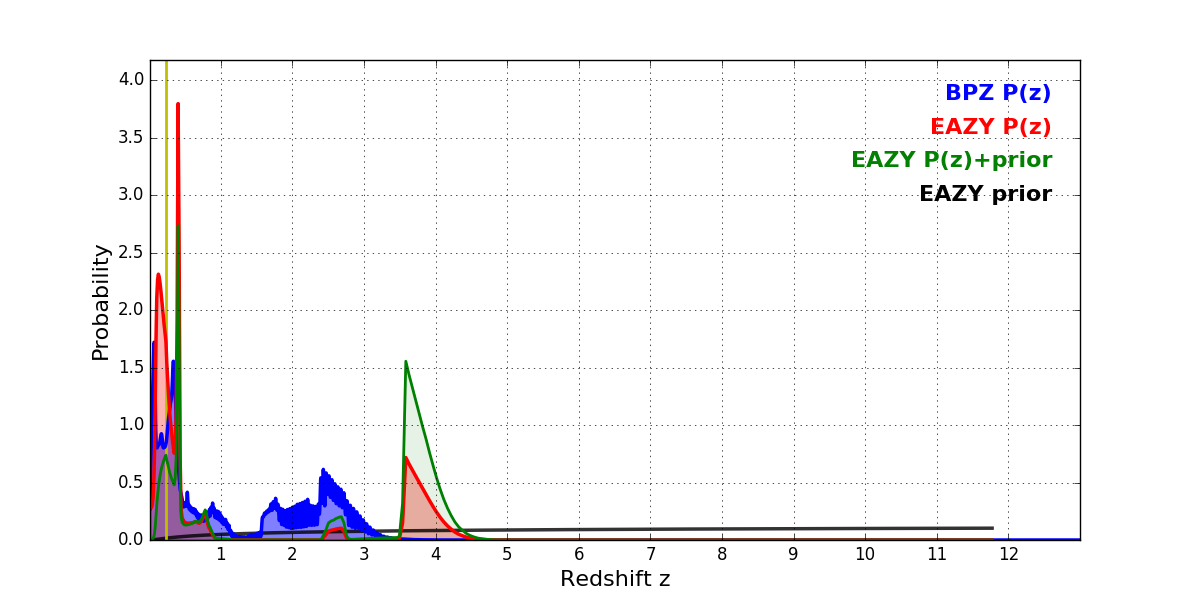In P(z) plots: Yellow lines mark the cluster redshift z = 0.228,