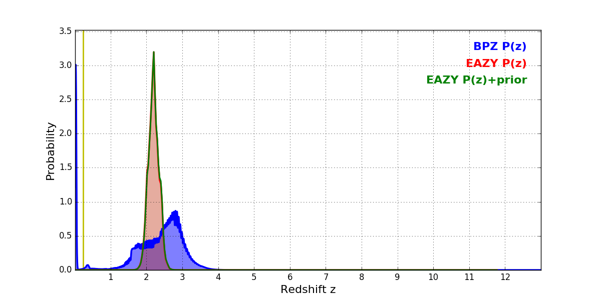 In P(z) plots: Yellow lines mark the cluster redshift z = 0.228,