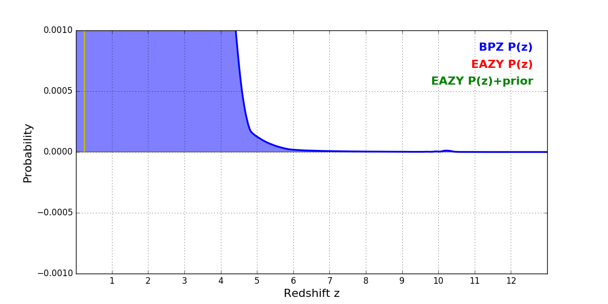 In P(z) plots: Yellow lines mark the cluster redshift z = 0.228,