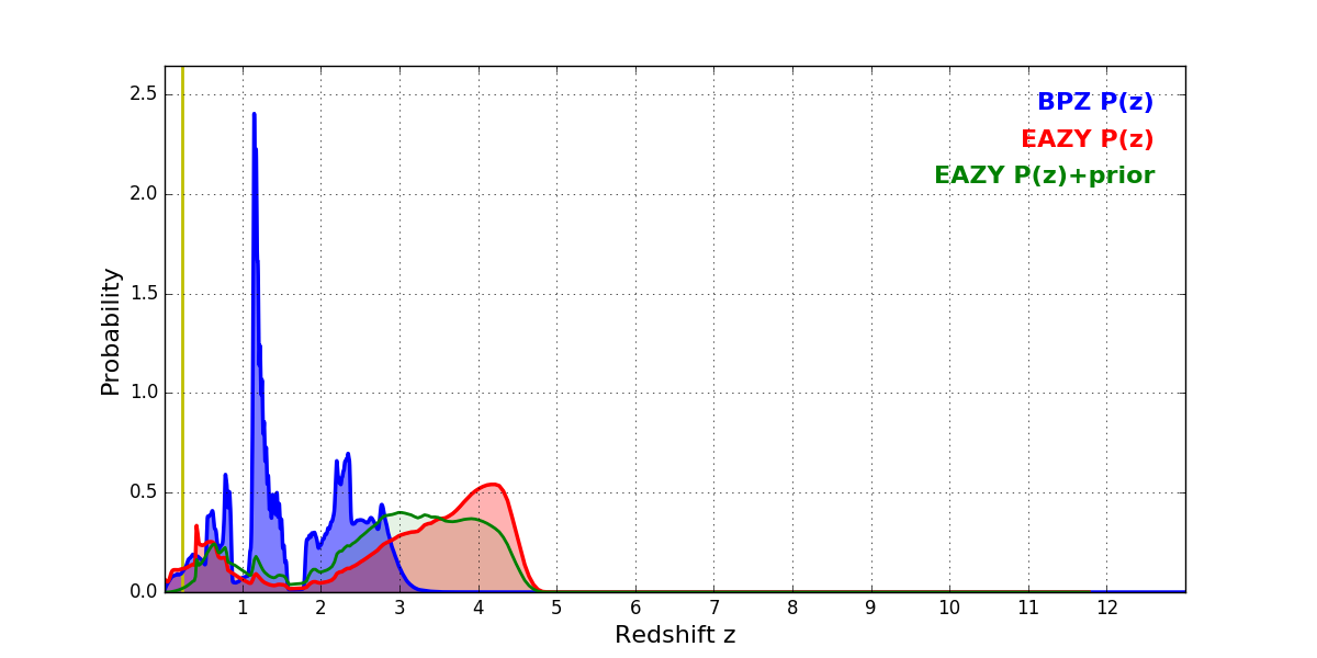 In P(z) plots: Yellow lines mark the cluster redshift z = 0.228,
