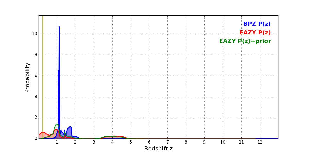 In P(z) plots: Yellow lines mark the cluster redshift z = 0.228,