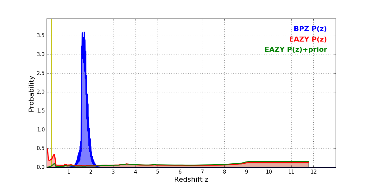 In P(z) plots: Yellow lines mark the cluster redshift z = 0.228,