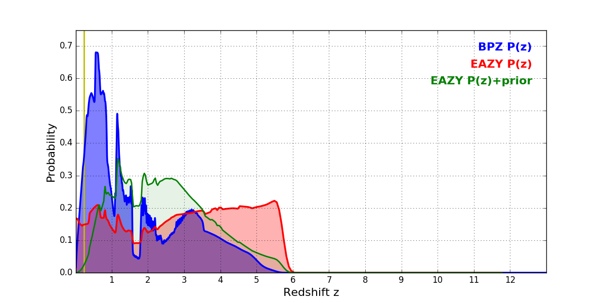 In P(z) plots: Yellow lines mark the cluster redshift z = 0.228,
