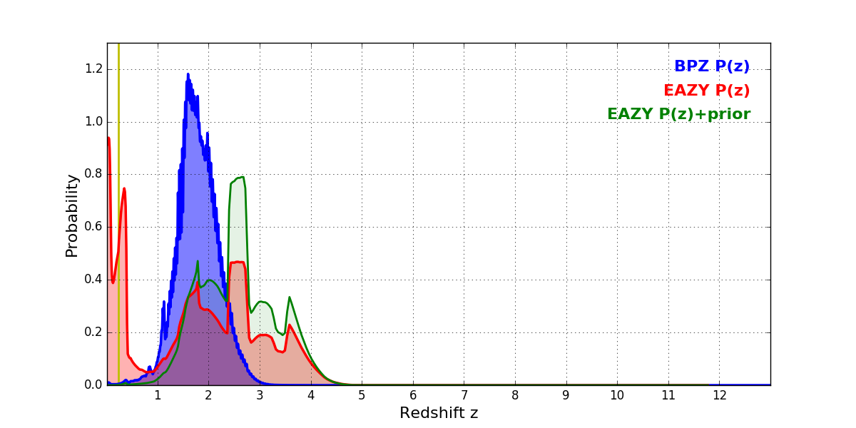 In P(z) plots: Yellow lines mark the cluster redshift z = 0.228,