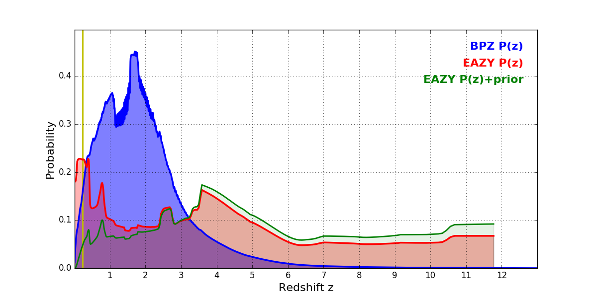 In P(z) plots: Yellow lines mark the cluster redshift z = 0.228,