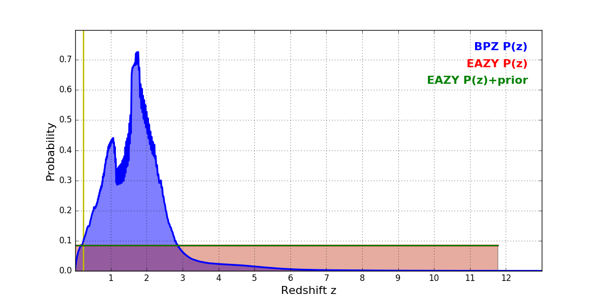 In P(z) plots: Yellow lines mark the cluster redshift z = 0.228,