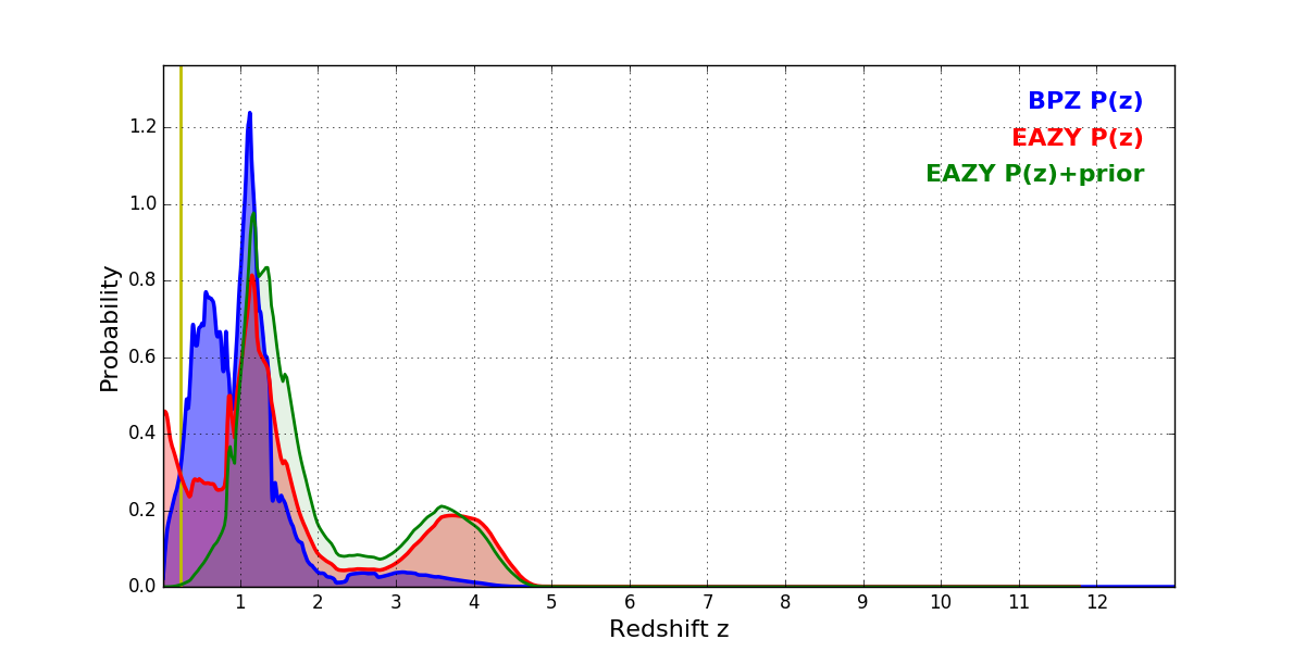 In P(z) plots: Yellow lines mark the cluster redshift z = 0.228,