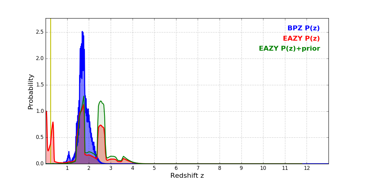 In P(z) plots: Yellow lines mark the cluster redshift z = 0.228,