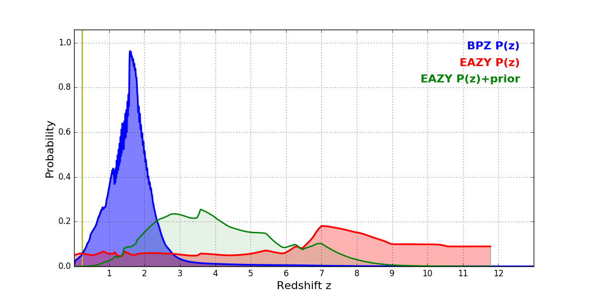 In P(z) plots: Yellow lines mark the cluster redshift z = 0.228,