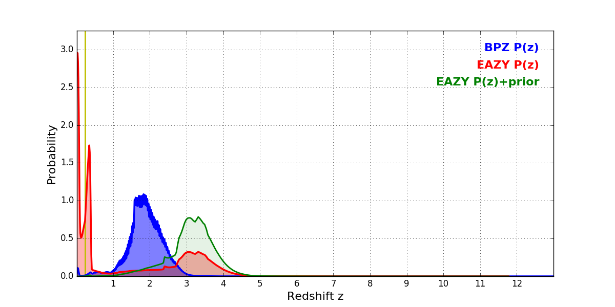 In P(z) plots: Yellow lines mark the cluster redshift z = 0.228,