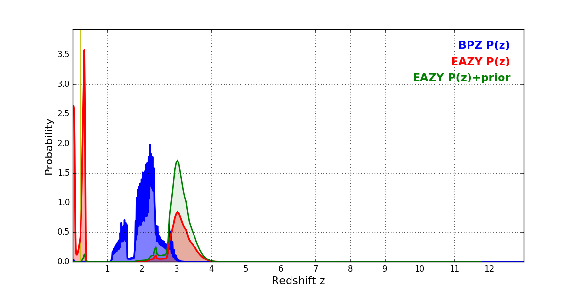 In P(z) plots: Yellow lines mark the cluster redshift z = 0.228,