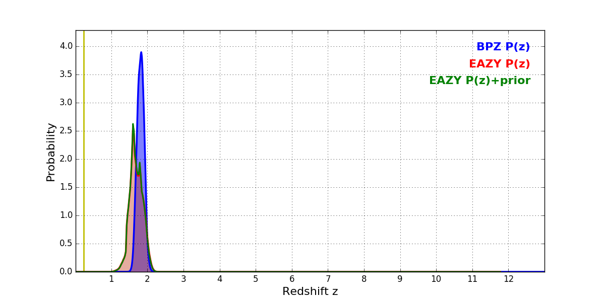 In P(z) plots: Yellow lines mark the cluster redshift z = 0.228,