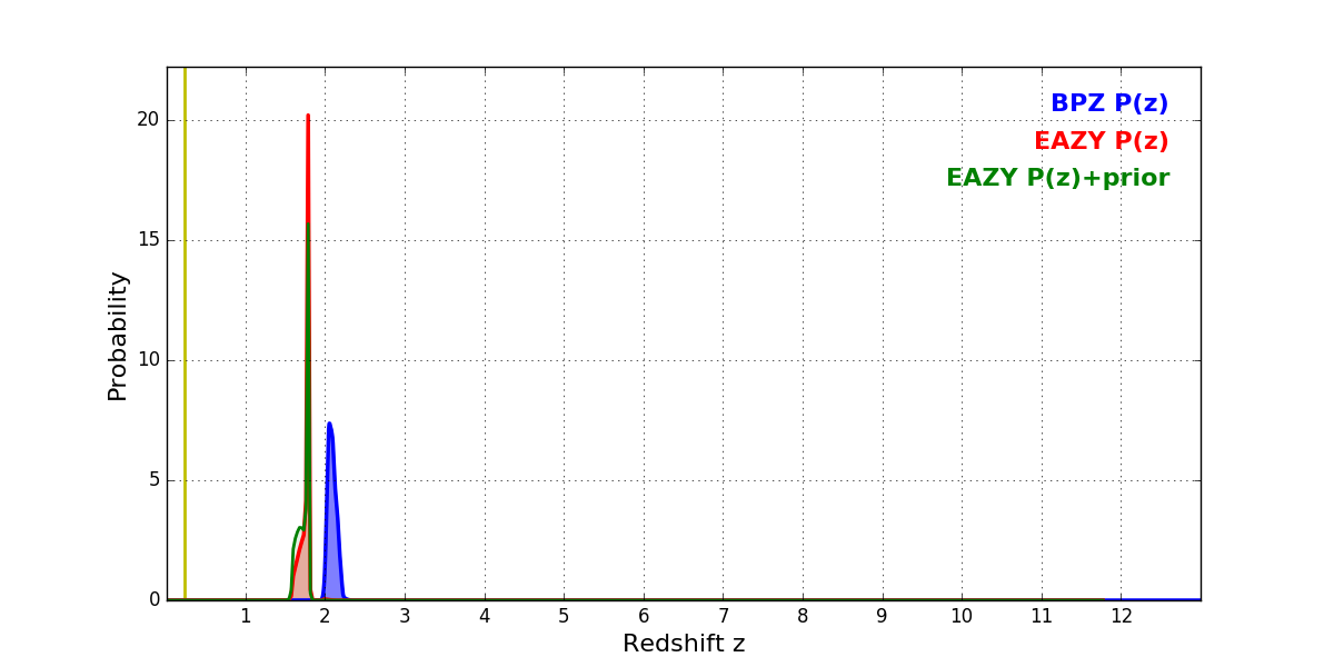 In P(z) plots: Yellow lines mark the cluster redshift z = 0.228,