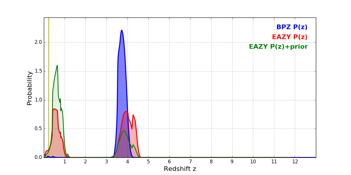 In P(z) plots: Yellow lines mark the cluster redshift z = 0.228,