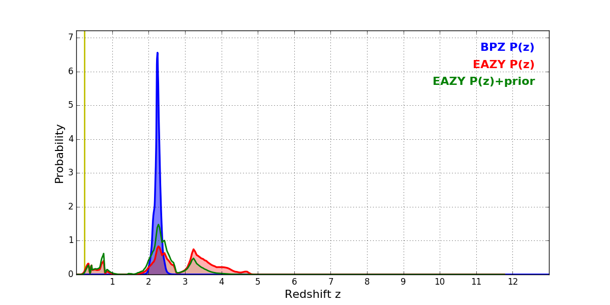 In P(z) plots: Yellow lines mark the cluster redshift z = 0.228,