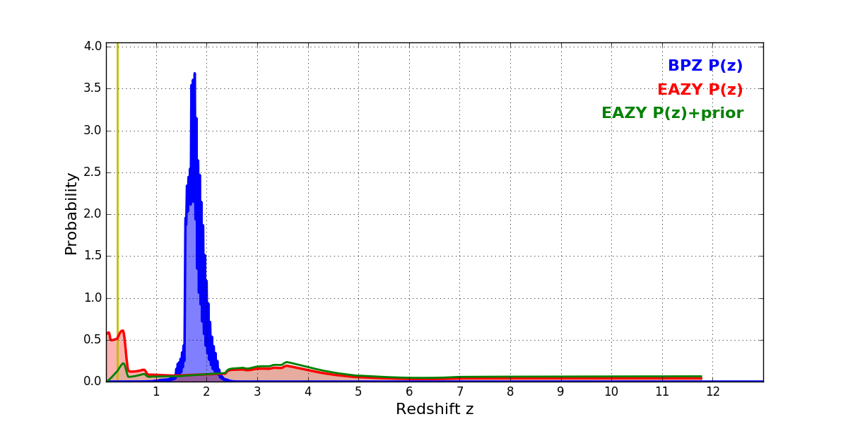 In P(z) plots: Yellow lines mark the cluster redshift z = 0.228,