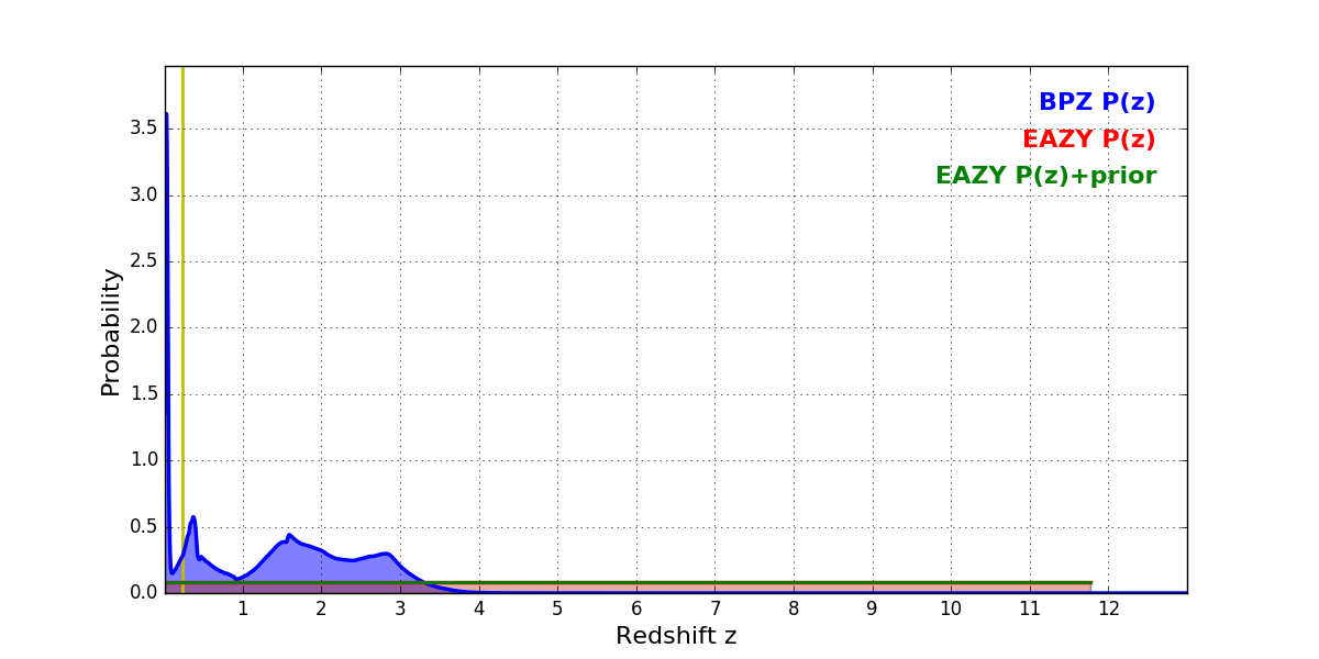 In P(z) plots: Yellow lines mark the cluster redshift z = 0.228,