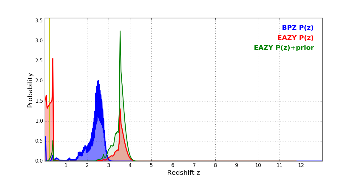 In P(z) plots: Yellow lines mark the cluster redshift z = 0.228,