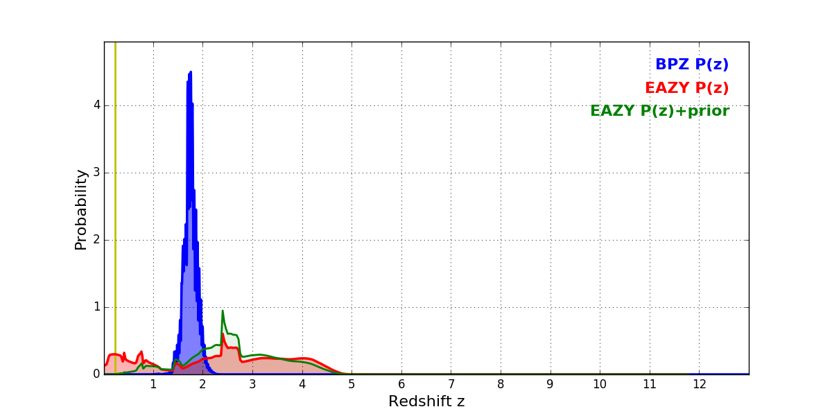 In P(z) plots: Yellow lines mark the cluster redshift z = 0.228,