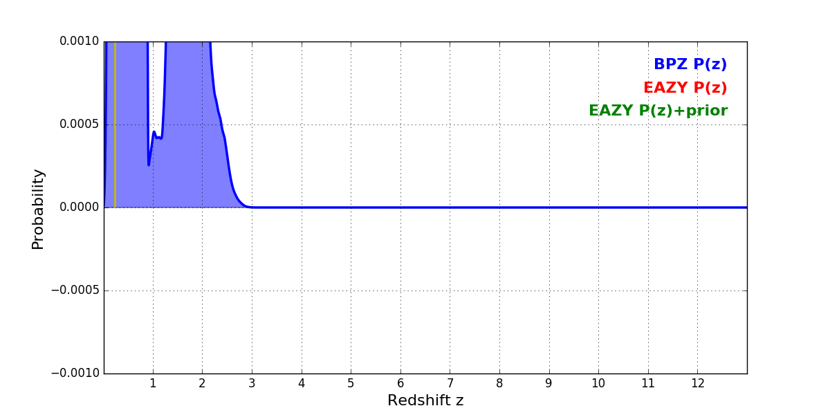 In P(z) plots: Yellow lines mark the cluster redshift z = 0.228,