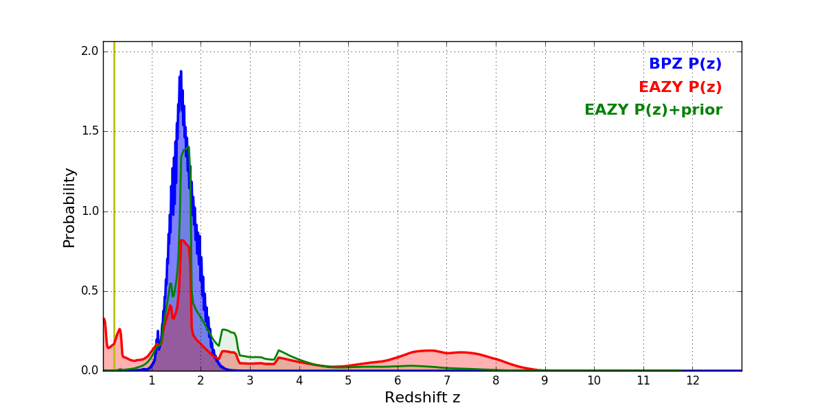 In P(z) plots: Yellow lines mark the cluster redshift z = 0.228,