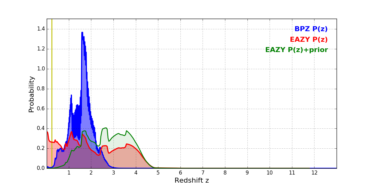 In P(z) plots: Yellow lines mark the cluster redshift z = 0.228,
