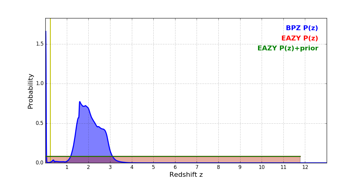 In P(z) plots: Yellow lines mark the cluster redshift z = 0.228,