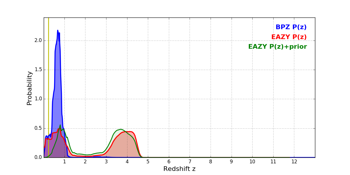 In P(z) plots: Yellow lines mark the cluster redshift z = 0.228,