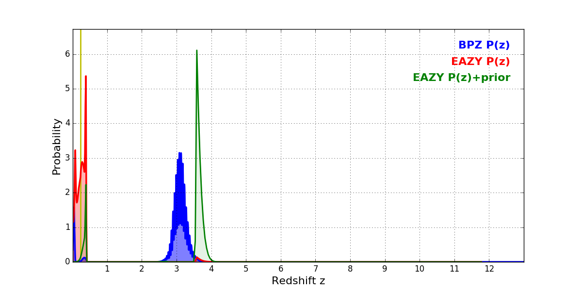 In P(z) plots: Yellow lines mark the cluster redshift z = 0.228,