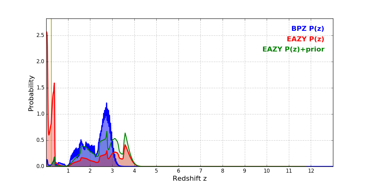 In P(z) plots: Yellow lines mark the cluster redshift z = 0.228,