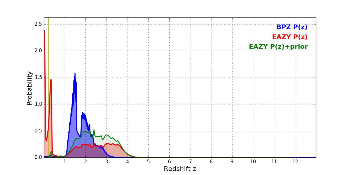 In P(z) plots: Yellow lines mark the cluster redshift z = 0.228,