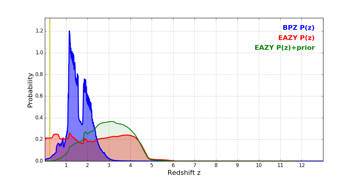 In P(z) plots: Yellow lines mark the cluster redshift z = 0.228,