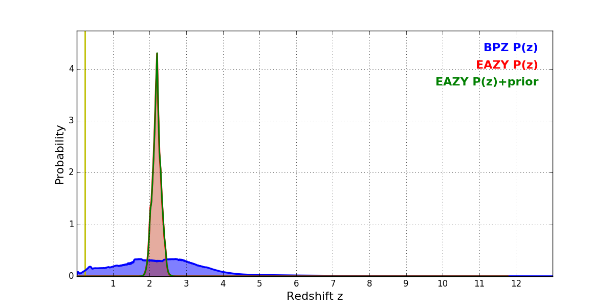 In P(z) plots: Yellow lines mark the cluster redshift z = 0.228,