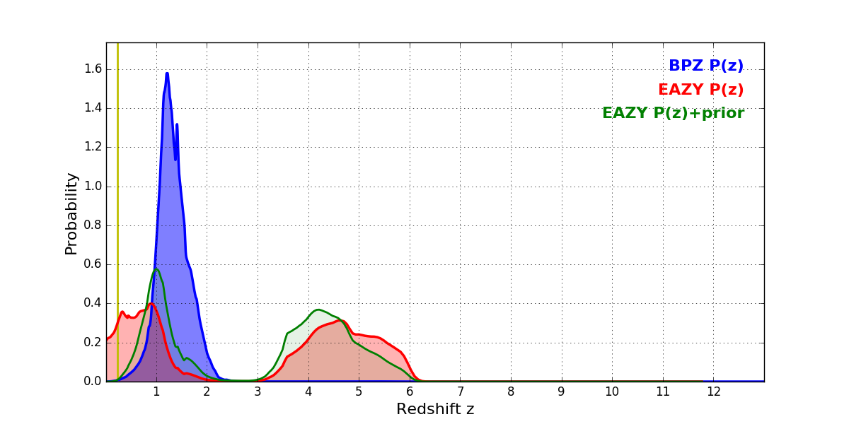 In P(z) plots: Yellow lines mark the cluster redshift z = 0.228,