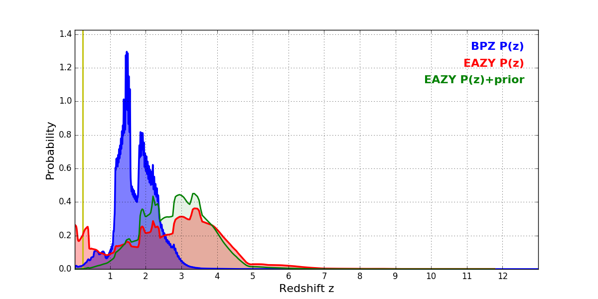 In P(z) plots: Yellow lines mark the cluster redshift z = 0.228,