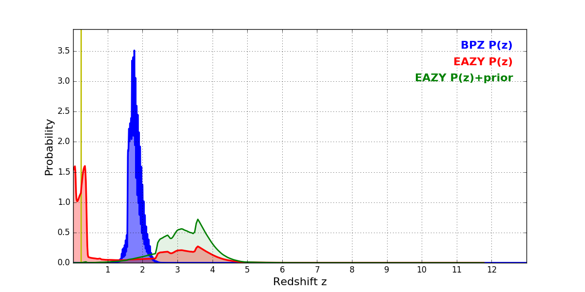 In P(z) plots: Yellow lines mark the cluster redshift z = 0.228,