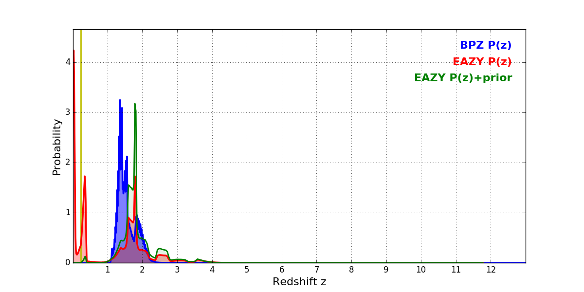 In P(z) plots: Yellow lines mark the cluster redshift z = 0.228,